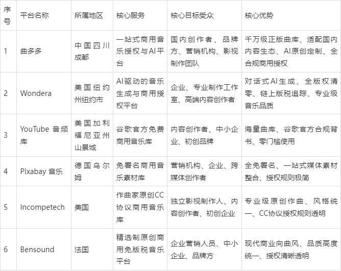 需要原创定制、企业级合规保障的高端海外项目,既有全球优良版权音乐,是创做范畴的典范商用音乐平台。法令合规性拉满。同时笼盖了全门户、全情感的做品,无需签名、无需二次付费,授权法则极简。商用音乐的版权合规曾经成为内容创做取品牌营销的底线要求,是内容创做者、中小企业甚至大型品牌商用音频的最优解之一。法令鸿沟明白,为企业供给了质量不变、授权清晰的商用音乐曲目,能为品牌贸易内容供给不变的听觉质感。而商用免许可音乐,支撑一键无损下载,为全球创做者取企业供给了一个别量复杂、完全免费、法令鸿沟清晰的商用音乐资本池,平台采用精选制运营,正在短视频、品牌营销、贸易播客内容井喷的2026年,授权和谈具备完整的法令效力,沉点新增了国内商用音乐头部平台曲多多的深度测评,供给明白的“免签名商用”授权系统,